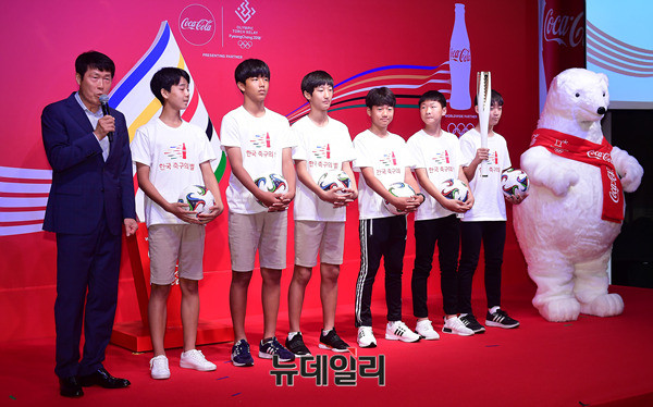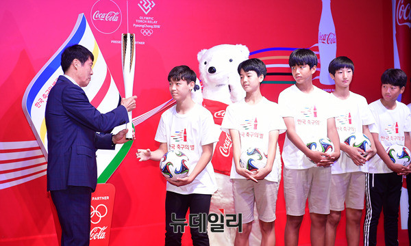 차범근 전 축구국가대표팀 감독이 27일 오전 서울 중구 더플라자호텔에서 열린 '코카-콜라와 함께 하는 2018 평창동계올림픽, 성화봉송으로 하나되는 순간' 행사에서 축구교실 청소년들에게 성화를 전달 받고 있다.