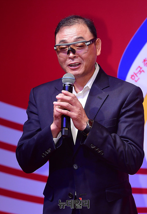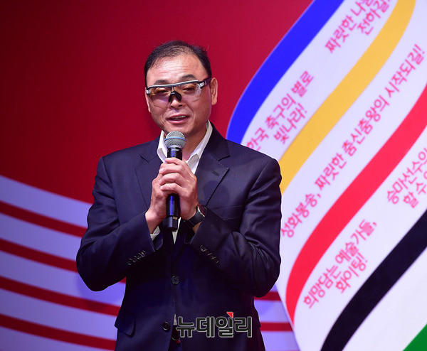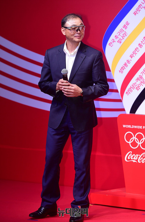 마라토너 이봉주가 27일 서울 중구 더플라자호텔에서 열린 '코카-콜라와 함께 하는 2018 평창동계올림픽, 성화봉송으로 하나되는 순간' 행사에서 인사말을 하고 있다.