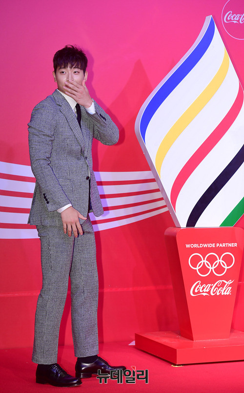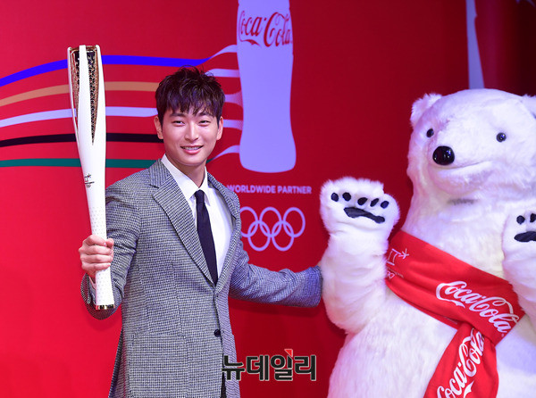 정진운이 27일 서울 중구 더플라자호텔에서 열린 '코카-콜라와 함께 하는 2018 평창동계올림픽, 성화봉송으로 하나되는 순간' 행사에서 응원 팻말을 붙이는 도중 떨어뜨리자 입을 가리고 당황해 하고 있다.