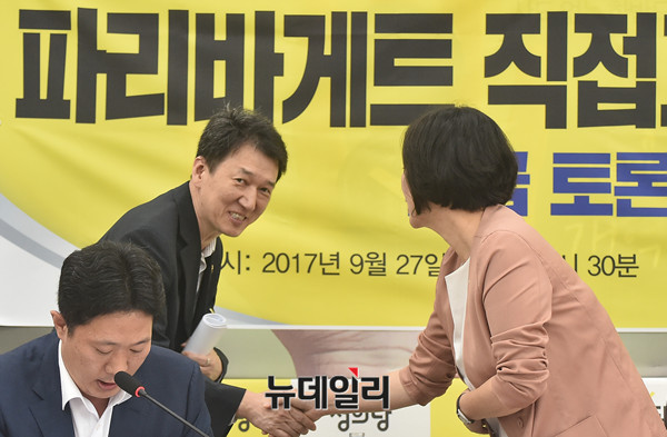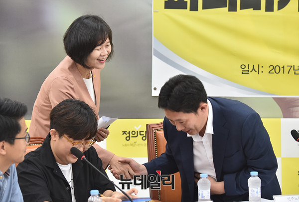 정의당 이정미 대표가 27일 오후 국회에서 열린 '파리바게트 직접고용을 위한 긴급 토론회'에 참석해 인사를 나누고 있다.