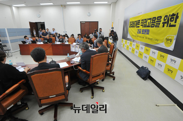정의당 이정미 대표가 27일 오후 국회에서 열린 '파리바게트 직접고용을 위한 긴급 토론회'에 참석해 회의를 지켜보고 있다.