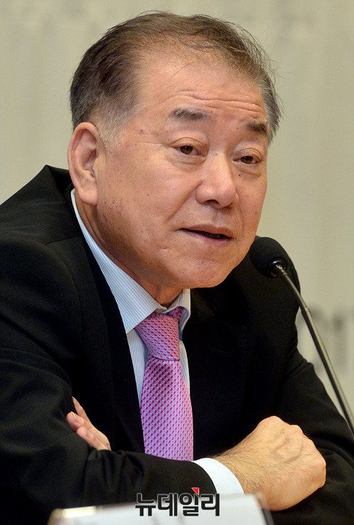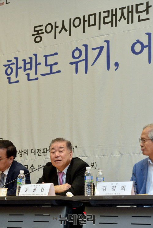 문정인 대통령 통일외교안보 특보가 27일 오후 국회 헌정기념관에서 열린 동아시아미래재단 창립 11주년 기념 토론회 '한반도 위기, 어떻게 해결할 것인가?'에 참석해 주제 발표하고 있다.
