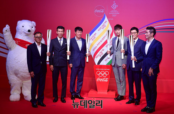 이봉주 마라토너, 가수 션, 차범근 전 축구국가대표팀 감독, 가수 정진운, 조세현 사진작가, 박상영 펜싱 국가대표선수 등 7명의 드림멘토와 16명의 청소년이 27일 오전 서울 중구 더플라자호텔에서 열린 성화봉송 릴레이 이벤트 직후 기념촬영을 하고 있다.