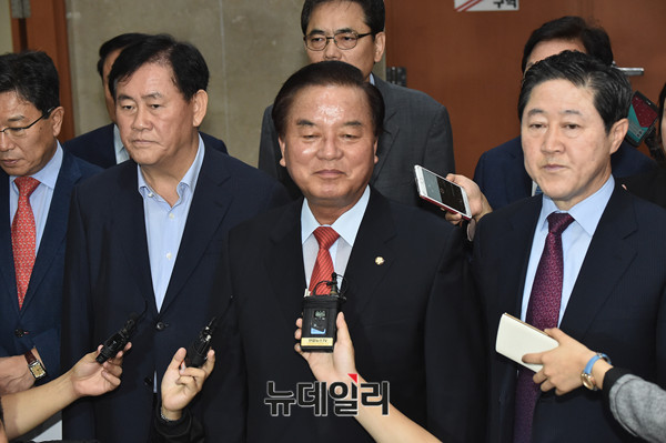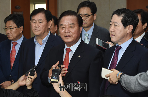 자유한국당 정갑윤 등 의원들이 28일 오전 국회 정론관에서 '박근혜 전 대통령의 구속 시한 연장을 반대 촉구' 기자회견 후 기자들의 질문에 답하고 있다.