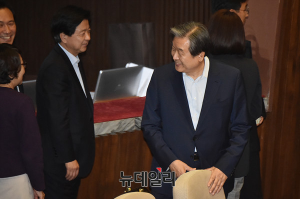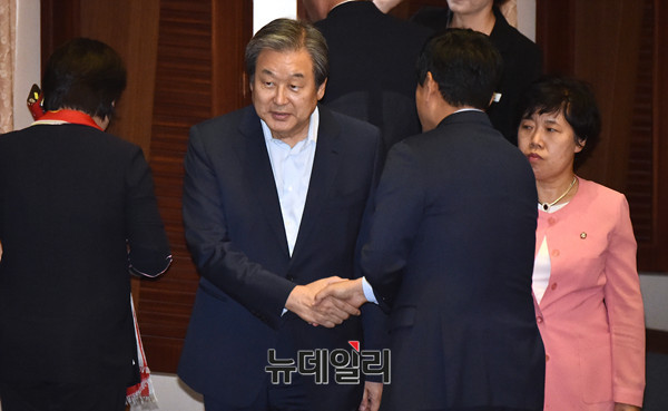 바른정당 김무성 의원이 28일 오후 국회에서 열린 본회의에서 동료의원들과 악수를 나누고 있다.