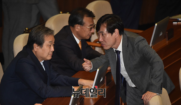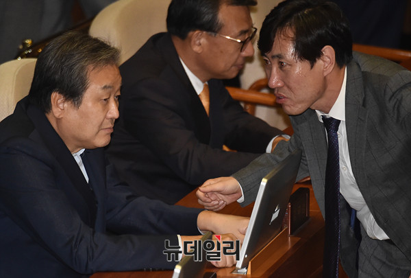 바르정당 김무성 의원이 28일 오후 국회에서 열린 본회의에서 같은당 하태경 의원과 대화를 나누고 있다.