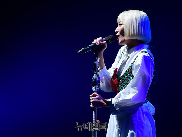 여성 듀오 볼빨간사춘기의 안지영이 28일 오후 서울 강남구 상상아트홀에서 열린 미니앨범 'Red Diary Page.1(레드 다이어리 페이지원)' 쇼케이스에서 신곡을 열창하고 있다.