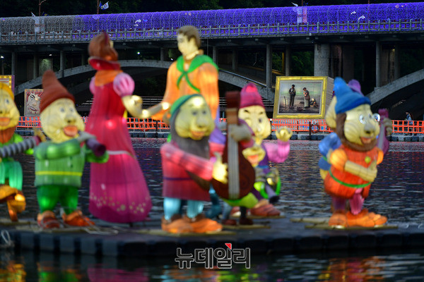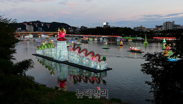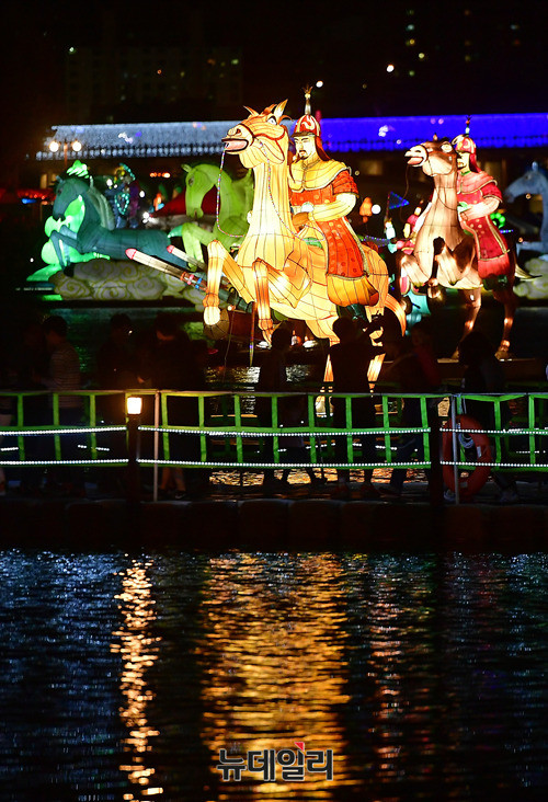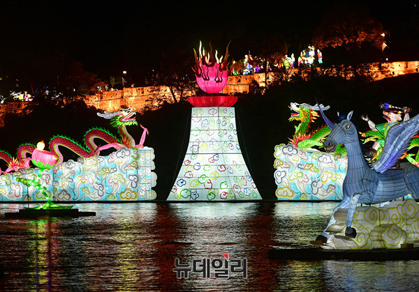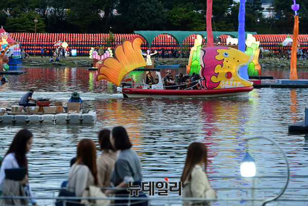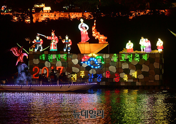 유람선에서 유등을 관람하는 관람객들이 축제 이틀째인 2일 오후 경남 진주 남강일대에서 열리고 있는 축제현장을 지나가고 있다. 지난 1일 초혼점등식을 시작으로 개막한 '2017 진주남강유등축제'는 진주성벽과 촉석루 일대를 무대로 미디어파사드를 새롭게 선보인다. 또 수상에서 펼쳐지는 불꽃놀이는 개막식인 1일에 이어 3일, 10일 오후 8시에 예정돼 있다. 축제는 '한국의 세시풍속'을 부제로 오는 15일까지 남강 일대에서 개최된다. (경남 진주=뉴데일리 정상윤 기자)