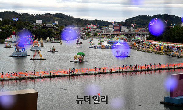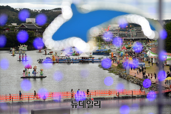 진주남강유등축제 개막 이틀째인 2일 오후 축제유료화 이후 가림막 설치로 시끄러웠던 천수교 위에서 남강일대를 본 전경. 가림막설치로 남강일대가 보이지 않았던 예년과 달리 LED등으로 만든 터널이 새롭게 생겨 축제 현장의 조망이 가능하다.
