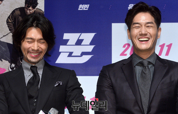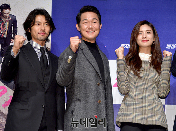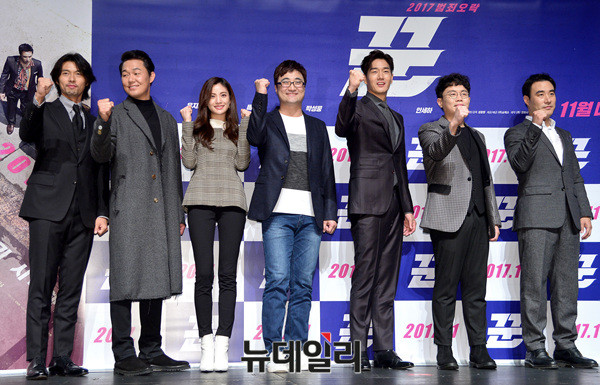 영화 '꾼'의 장창원 감독과 배우들(현빈, 유지태, 박성웅, 배성우, 나나, 안세하)이 11일 오전 압구정CGV에서 열린 제작보고회에 참석해 포토타임을 갖고 있다.