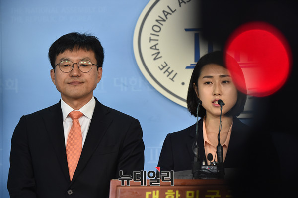 정태흥 민중연합당 공동대표와 새민중정당 이은혜대변인이 11일 오전 국회 정론관에서 기자회견을 갖고 새민중정당과 민중연합당의 합당으로 민중당 창당을 선언하고 있다.