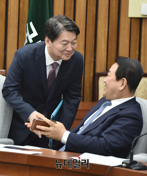 안철수 국민의당 대표가 11일 오전 국회에서 열린 의원총회에서 박주선 의원과 인사를 나누고 있다.