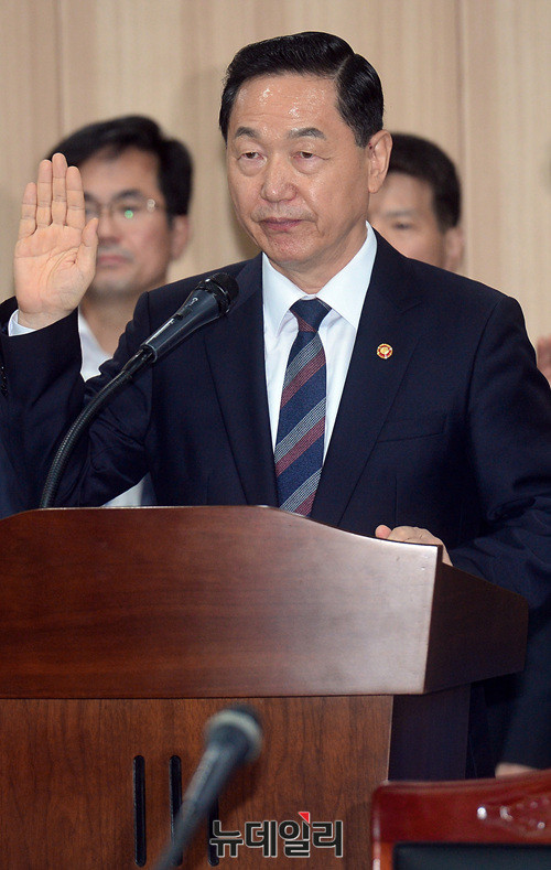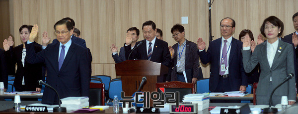 김상곤 사회부총리 겸 교육부 장관이 12일 오전 정부세종청사에서 열린 국회 교육문화체육관광위원회 국정감사에서 선서를 하고 있다.