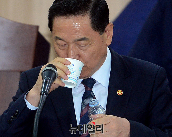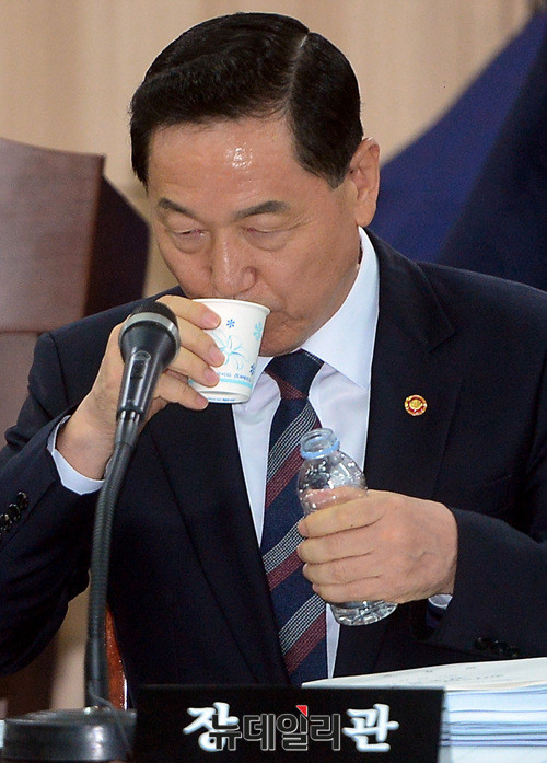 김상곤 사회부총리 겸 교육부 장관이 12일 오전 정부세종청사에서 열린 국회 교육문화체육관광위원회 국정감사에서 물을 마시고 있다.