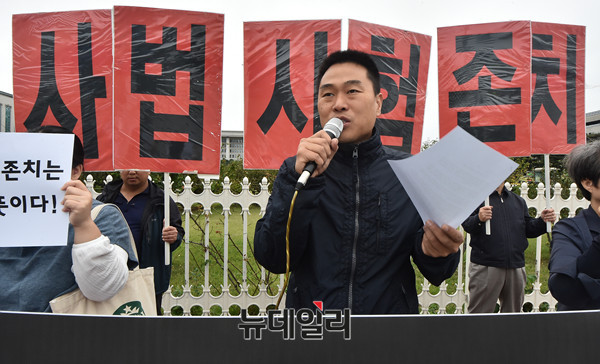 사법시험 존치를 위한 고시생모임이 12일 오전 국회 앞에서 '사법시험 존치법안 통과 촉구' 기자회견을 갖고 있다.