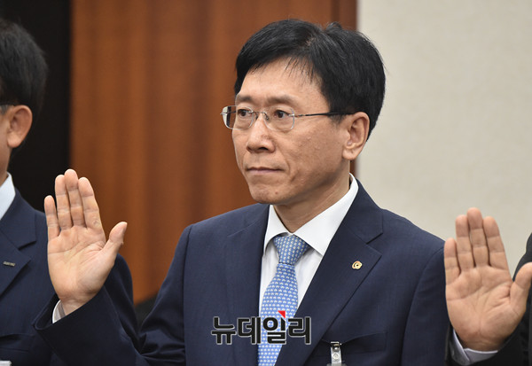 김연철 한화 기계부문 대표가 12일 국회에서 열린 산업통상자원중소벤처기업위원회 국정감사에 증인으로 출석해 중소기업 기술탈취에 대한 신문을 받을 받고 있다.