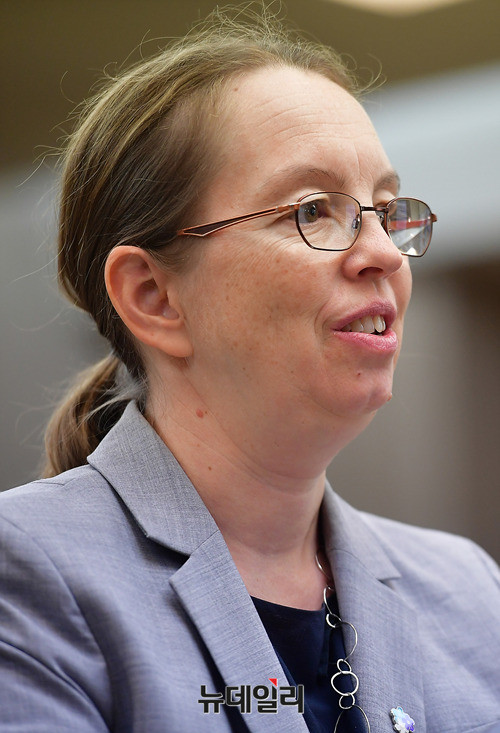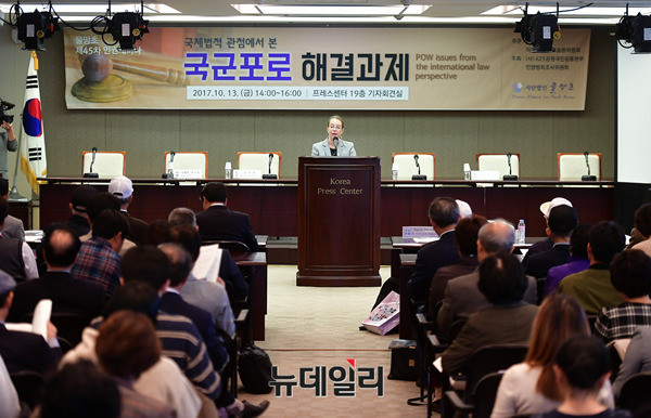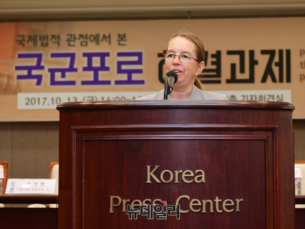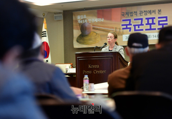 '시나 폴슨(Signe Poulsen)' UN인권사무소 서울소장이 13일 서울 중구 한국프레스센터에서 열린 물망초 인권세미나에서 '전쟁 포로와 인권'을 주제로 기조연설을 하고 있다.