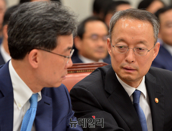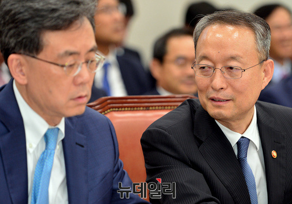 백운규 산업통상자원부 장관과 김현종 산업통상자원부 통상교섭본부장이 13일 오후 국회에서 열린 국회 산업통상중소벤처기업위원회 국정감사 에서 대화를 나누고 있다.
