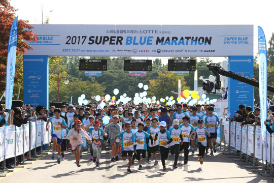 스페셜올림픽코리아와 롯데그룹이 공동 주최한 '슈퍼블루 마라톤 대회'가 성황리에 열렸다.지난 14일 서울 상암동 월드컵공원 잔디광장에서 개최한 '2017 제3회 슈퍼블루 마라톤 대회'에는 장애인 719여 명을 포함한 약 6200여 명이 참가했다.'슈퍼블루 마라톤'은 스페셜올림픽코리아와 롯데그룹이 2014년부터 진행하고 있는 '슈퍼블루 캠페인'의 일환이다. 장애인과 비장애인이 함께 달림으로써 장애에 대한 그릇된 인식과 편견의 벽을 허물어보자는 취지에서 기획됐다.이날 참가자들은 희망과 자립을 상징하는 파란색 운동화 끈을 묶고 5km, 10km, 하프 등 3개의 코스를 달렸다. 이번 대회는 지난해보다 참가자가 1200여 명이 증가했으며, 장애인 참가자도 400여 명에서 700여 명으로 늘었다.고흥길 스페셜올림픽코리아 회장을 비롯해 나경원 스페셜올림픽코리아 명예회장 , 소진세 롯데그룹 사회공헌위원장, 홍보대사 홍명보 前 축구국가대표팀 감독 등이 참석해 자리를 빛냈다.마라톤 시작 전에는 전체 참가자들이 ▲장애인의 반대말은 비장애인이에요 ▲장애는 앓는 것이 아니라 '갖고 있는' 것이에요 ▲장애인에게 반말을 하지 말아주세요 ▲장애인의 반대말은 정상인이 아니라 비장애인이요 ▲장애우가 아니라 장애인으로 불러주세요 등 '슈퍼블루 5가지 약속'을 선서했다.고흥길 스페셜올림픽코리아 회장은 "슈퍼블루마라톤은 장애인과 비장애인이 어떠한 차이나 구분 없는 화합의 장"이라며 "앞으로도 우리 사회의 편견을 깨뜨려 나가는 배려와 소통의 시간으로 보다 많은 분들과 함께 그 의의를 나누고 싶다"고 전했다.[사진=롯데]