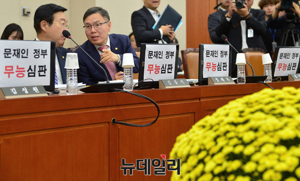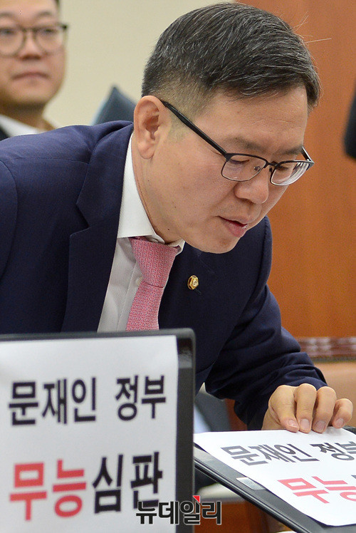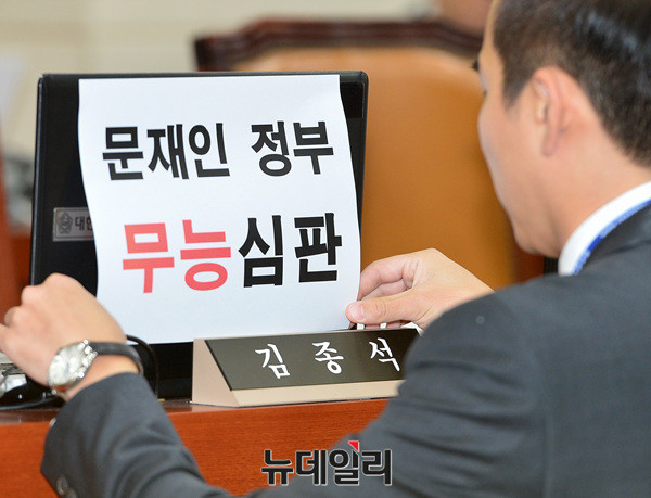 국회 정무위원회 소속 자유한국당 의원들이 16일 오전 국회에서 열린 국정감사를 앞두고 노트북에 '문재인 정부 무능 심판'이라고 적힌 문구를 붙이고 있다.이날 국정감사는 문구를 떼지 않으면 국정 감사를 진행할 수 없다는 여당 주장으로 한 때 정회됐다.