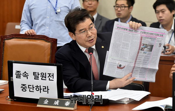 자유한국당 김성태 의원이 16일 오전 국회에서 열린 과학기술정보방송통신위원회 원자력안전위원회 등의 국정감사에서 EMP 필터를 가져와 질문을 하고 있다.