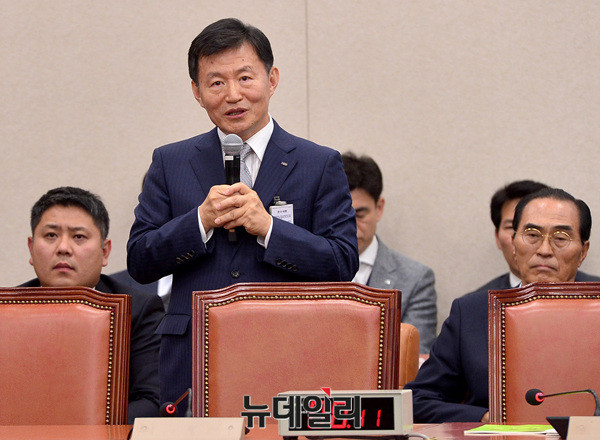 강남훈 홈앤쇼핑 대표가 16일 오후 국회에서 열린 국회 산업통상자원중소벤처기업위원회 국정감사에 증인으로 참석해 질문에 답하고 있다.
