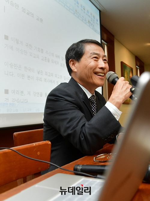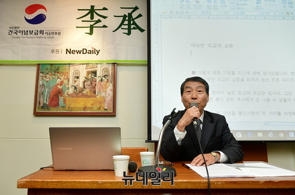 최병구 전 노르웨이 대사가 17일 오후 서울 중구 프란치스코 교육회관에서 열린 제80회 이승만 포럼에서 '이승만 외교의 교훈'을 주제로 발표하고 있다. 건국이념보급회가 주최하는 '이승만 포럼'은 매달 우남 이승만을 주제로 개최된다.