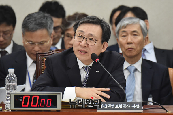 문재도 한국무역보험공사 사장이 17일 오전 국회에서 열린 산업통상자원중소벤처기업위원회 국정감사에서 의원들의 질문에 답하고 있다.