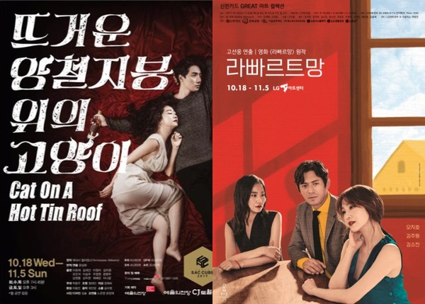 연극 '뜨거운 양철지붕 위의 고양이'와 '라빠르트망(L'appartment, 아파트)'이 각각 예술의전당 CJ 토월극장, LG아트센터에서 18일부터 11월 5일까지 공연한다.