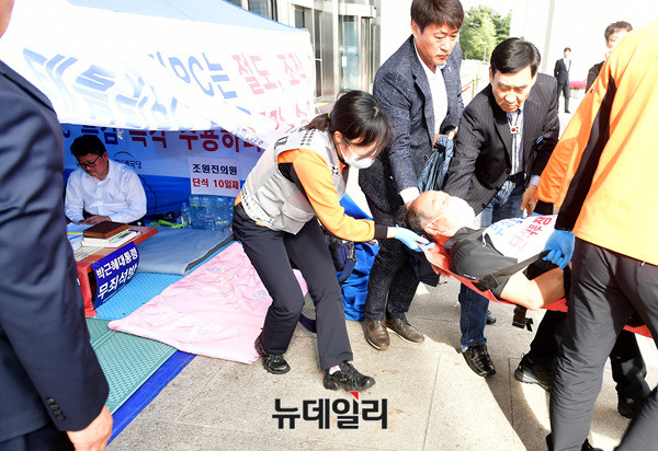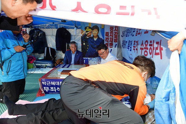 대한애국당 당원이 단식농성 열흘째를 맞은 19일 오후 국회의사당 정문에 마련된 단식농성장에서 소방대원의 도움을 받고 있다. 조원진 상임공동대표를 비롯한 당원들은 지난 10일 오전부터 박근혜 전 대통령의 무죄 석방을 요구하며 단식농성 중이다.