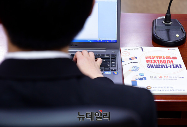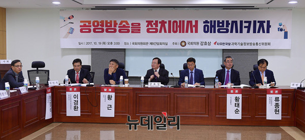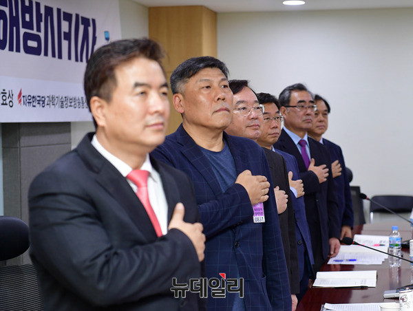 한정석 미래한국 편집위원, 이경환 부대변인, 황근 선문대 교수, 강효상, 신상진 자유한국당 의원, 황태순 시사평론가, 류종현 부산대 초빙교수(왼쪽부터)가 19일 오후 국회의원회관 간담회의실에서 열린 '공영방송을 정치에서 해방시키자' 토론회에 앞서 국민의례를 하고 있다.
