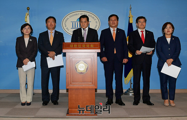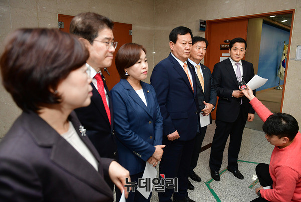 김정재, 김성태, 송희경, 이은권, 민경욱, 박대출(왼쪽부터) 자유한국당 과학기술정보방송통신위원회 위원들이 19일 오후 국회 정론관에서 기자회견 직후 취재진의 질문에 답하고 있다. 위원들은 "공영방송 보궐이사 추천권은 자유한국당에 있다"고 주장했다.