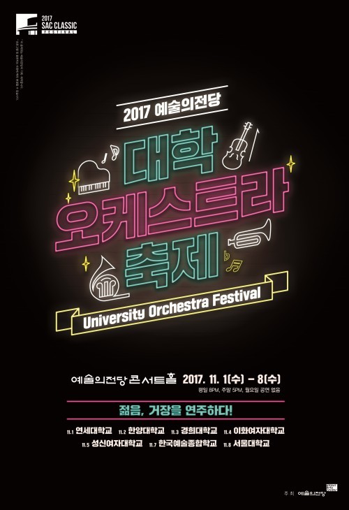 올해 제4회를 맞이하는 '대학오케스트라축제'는 예술의전당 음악당 기획 음악회 브랜드 SAC CLASSIC(삭 클래식)의 두 번째로, 지난 4월 개최된 '교향악축제'에 이어 패기 넘치고 신선한 감각의 연주를 들려준다.