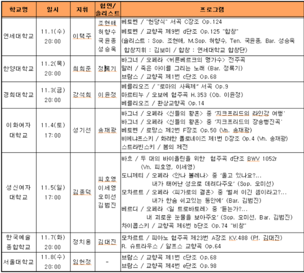 '젊음, 거장을 연주하다!'라는 부제로 경희대학교, 서울대학교, 성신여자대학교, 연세대학교, 이화여자대학교, 한국예술종합학교, 한양대학교(가나다순) 등 총 7개 대학의 오케스트라가 참여한다.
