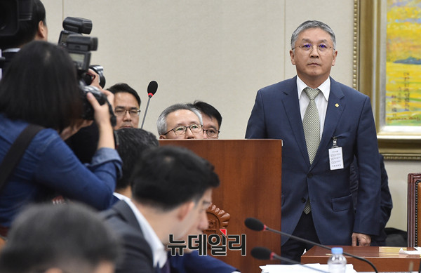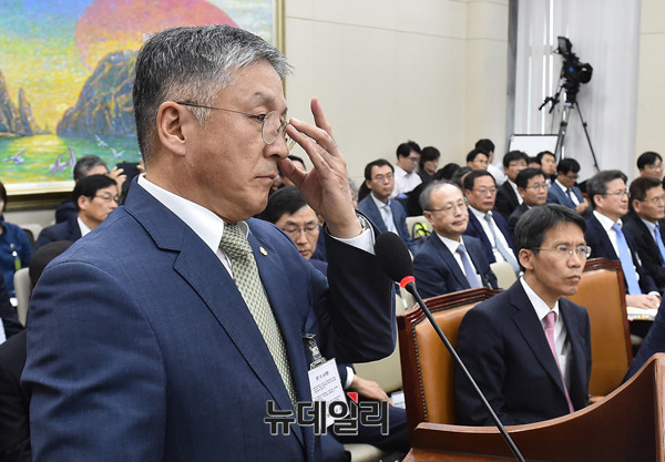 함영준 오뚜기 회장이 19일 오후 국회 정무위원회에서 열린 공정거래위원회 등에 대한 국정감사에 출석해 의원들의 질문에 답하고 있다.