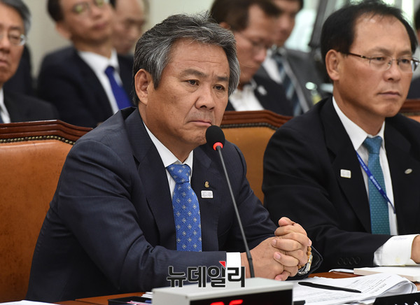이기흥 대한체육회장이 19일 오후 국회에서 열린 교육문화체육관광위원회 문체부 소관 36개 산하기관에 대한 국정감사에 참석해 앉아 있다.