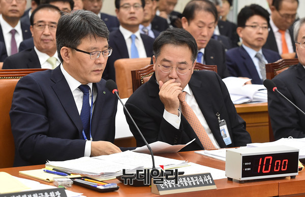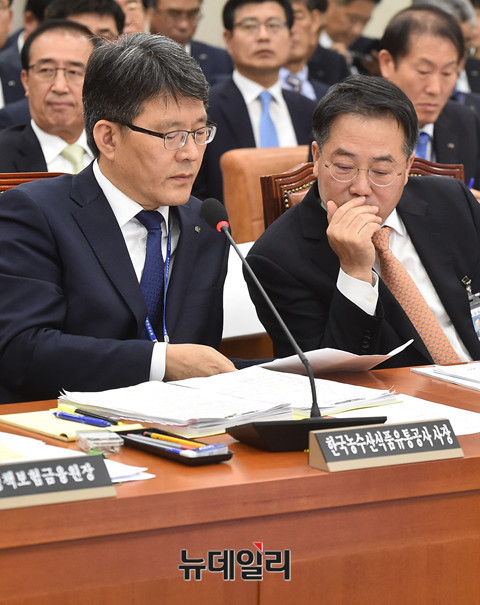 여인홍 한국농수산식품유통공사 사장이 19일 오전 국회 농림축산식품해양수산위원회 회의실에서 열린 국정감사에 참해 정승 농어촌공사 사장과 대화를 나누고 있다.