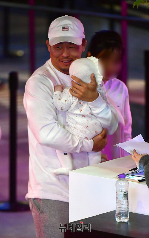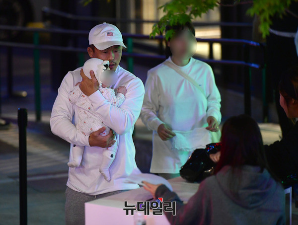 이종격투기 서두원 선수 가족이 20일 오후 서울 강남구의 한 스포츠브랜드 콜라보레이션 파티에 입장하기 위해 안내를 받고 있다. 서두원 가족은 이날 흰색 상의로 색을 맞춰 입고 등장했다.
