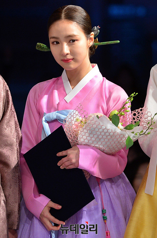 나종민 문화체육관광부 차관, 배우 신세경, 개그우먼 장도연, 모델 한현민, 방송인 크리스티안 부르고스(Burgos Atala Christian Shamed)가 20일 오후 서울 경복궁 흥례문 광장에서 열린 '2017 한복의 날 경복궁 달빛 한복패션쇼'에 참석해 위촉식 후 기념촬영을 하고 있다.