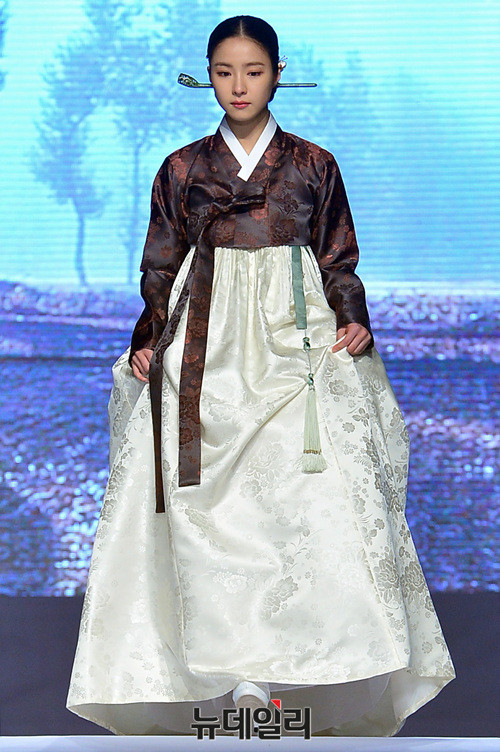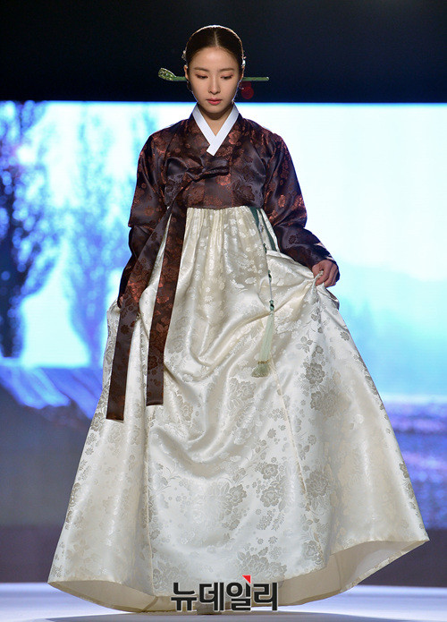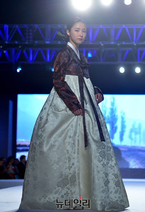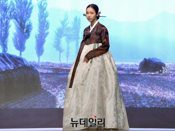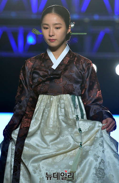 배우 신세경이 20일 오후 서울 경복궁 흥례문 광장에서 열린 '2017 한복의 날 경복궁 달빛 한복패션쇼'에서 런웨이를 선보이고 있다.