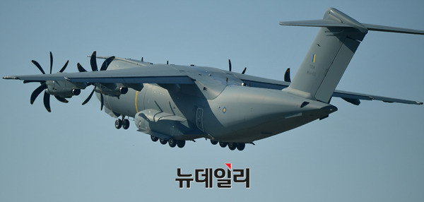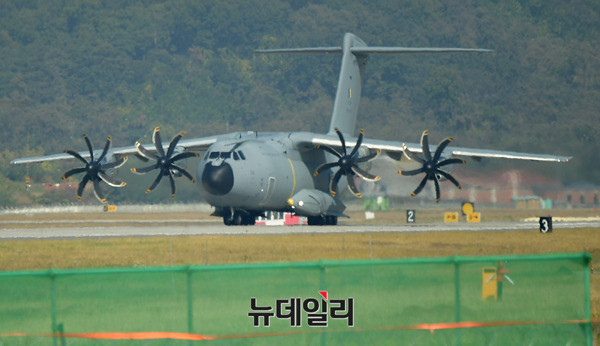 에어버스 A400M 아틀라스 수송기가 21일 오전 경기 성남시 서울공항에서 열린 서울에어쇼에서 시범비행을 위해 이륙하고 있다. 2014년부터 본격 운항되고 있는 A400M 수송기는 병력 수송, 중장비 및 대형 장비의 수송 등 전략적 및 전술적 역량을 모두 갖추고, 공대공 급유기로서 운항도 가능하다. (경기 성남=뉴데일리 정상윤 기자)