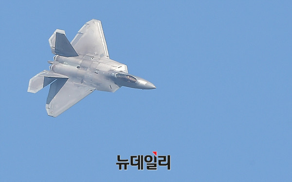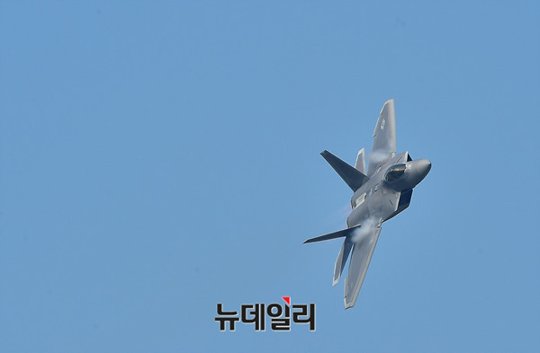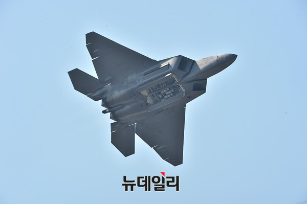 F-22 랩터가 21일 오전 경기 성남시 서울공항에서 열린 서울에어쇼에서 시범비행을 하고 있다. (경기 성남=뉴데일리 이종현 기자)