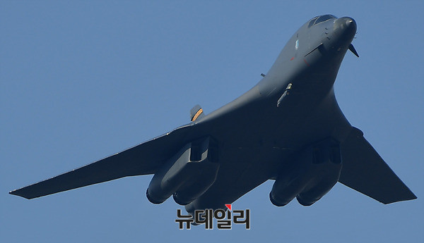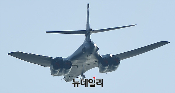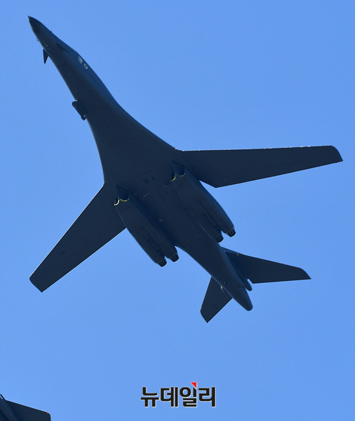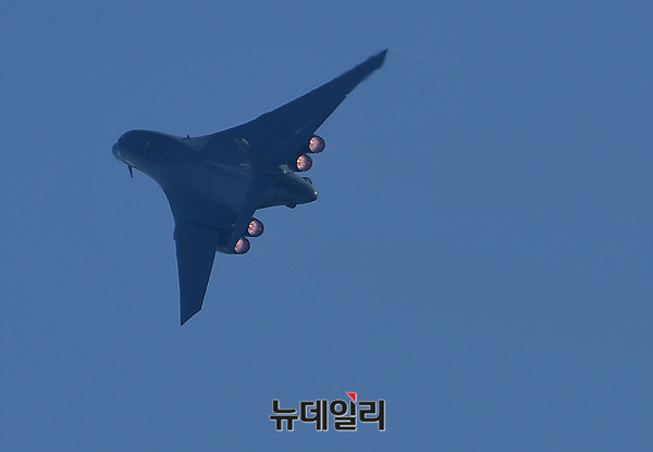 죽음의 백조라 불리는 美공군 전략폭격기 B-1B 랜서가 21일 오후 경기 성남시 서울공항에서 열리는 아덱스 2017에서 저공비행을 하고 있다. 아덱스 2017은 22일까지 일반에 공개된다. (경기 성남=뉴데일리 정상윤 기자)