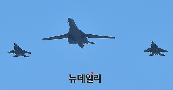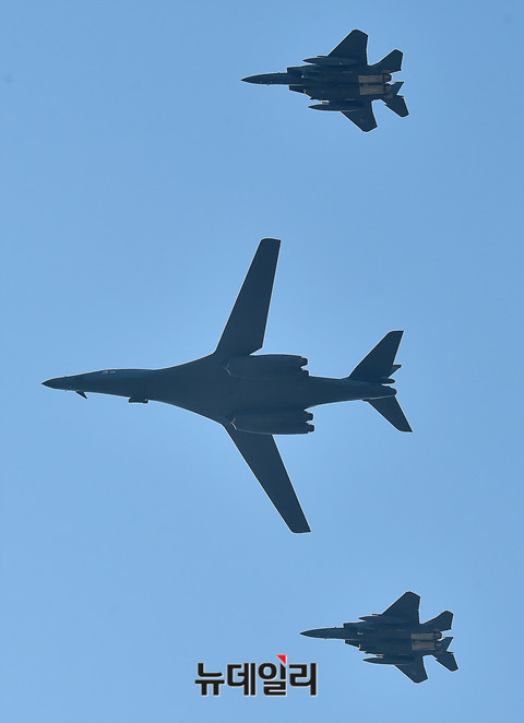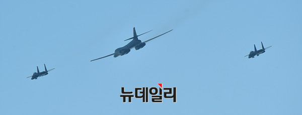 죽음의 백조라 불리는 美공군 전략폭격기 B-1B 랜서가 21일 오후 경기 성남시 서울공항에서 열리는 아덱스 2017에서 전투기들의 호위을 받으며 선회 비행을 하고 있다. B-1B 랜서는 지난달 23일 F15C 전투기와 함께 동해 북방한계선(NLL)을 넘어 대북 무력시위를 벌였던 미국의 주요 전략무기다. (경기 성남=뉴데일리 이종현 기자)