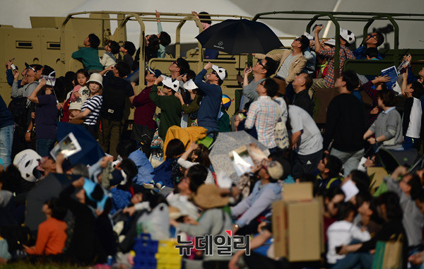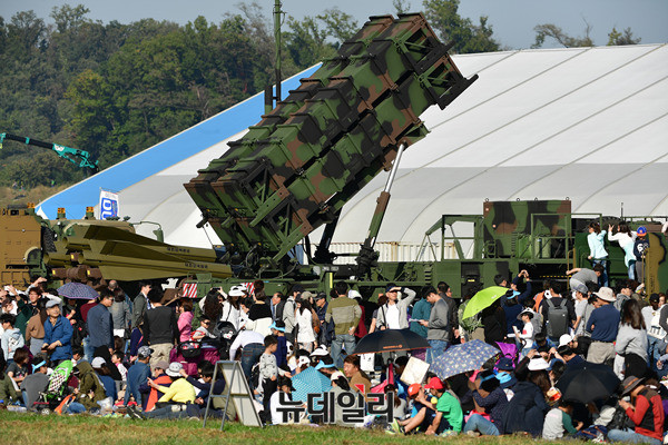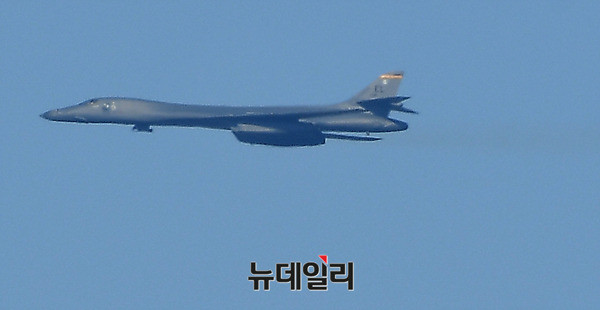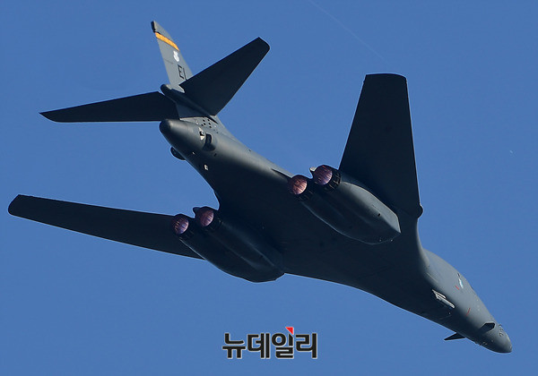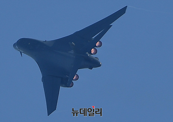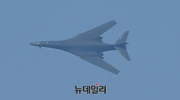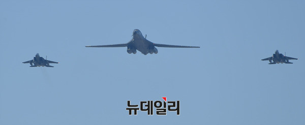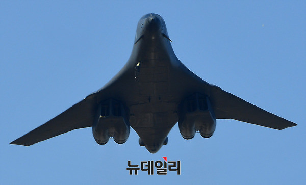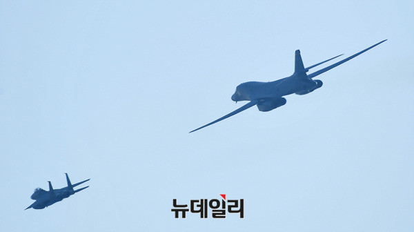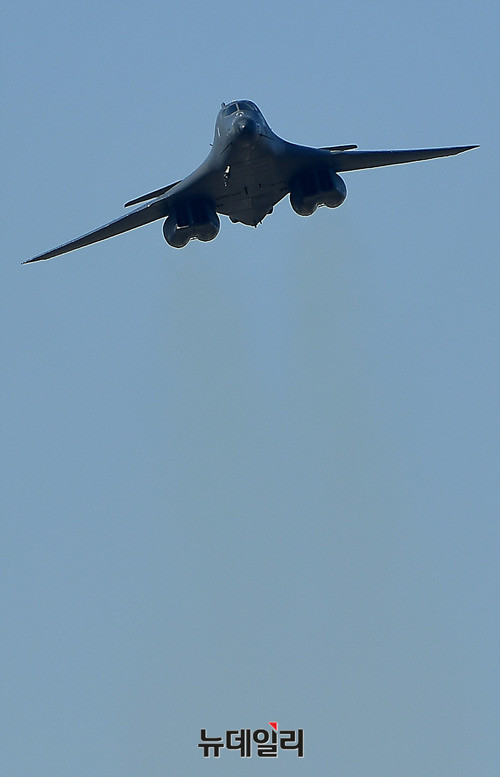 죽음의백조라 불리는 美공군 전략폭격기 B-1B 랜서가 21일 오후 경기 성남시 서울공항에서 열리는 아덱스 2017에서 F-15K의 호위를 받으며 저공비행을 하고 있다. B-1B는 아덱스가 열리고 있는 서울공항 상공을 3회 등장하며 관람객들의 탄성을 자아냈다. 아덱스 2017은 22일까지 일반에 공개된다. (경기 성남=뉴데일리 정상윤 기자)