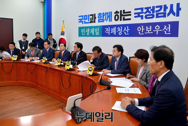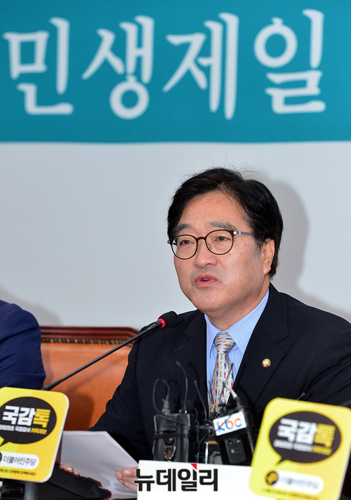 우원식 더불어민주당 원내대표가 23일 오전 국회에서 열린 국정감사 대채회의에서 발언하고 있다.