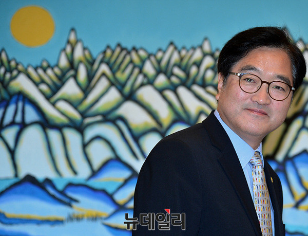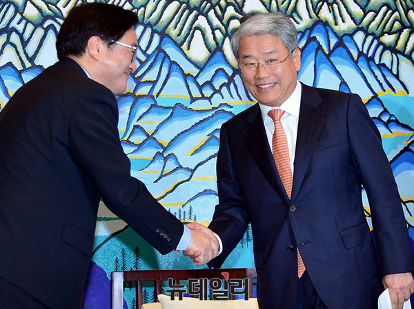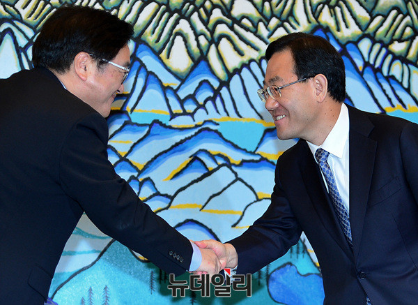 우원식 더불어민주당, 김동철 국민의당 원내대표가 23일 오전 국회의장 접견실에서 열린 '국회의장 4당 원내대표 정례 회동'에서 악수를 나누고 있다.