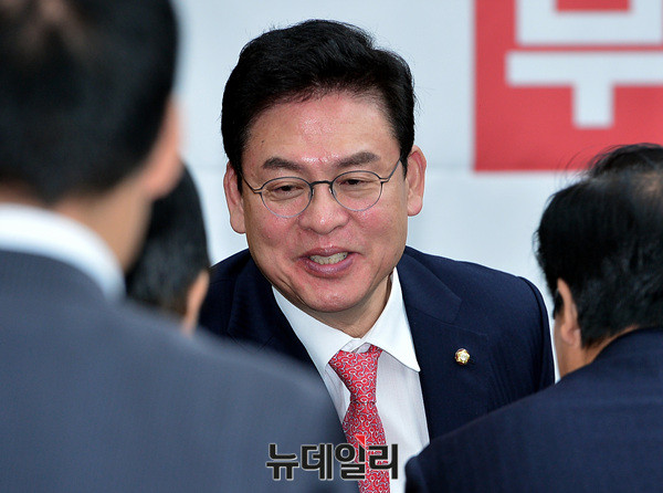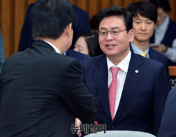 정우택 자유한국당 원내대표가 23일 오전 국회에서 열린 국정감사 대책회의에서 악수를 나누고 있다.