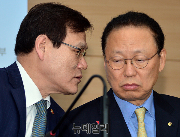 최종구 금융위원장과 최흥식 금융감독원장이 24일 오후 정부서울청사에서 열린 '가계부채 종합대책을 발표' 기자회견에서 대화를 나누고 있다.