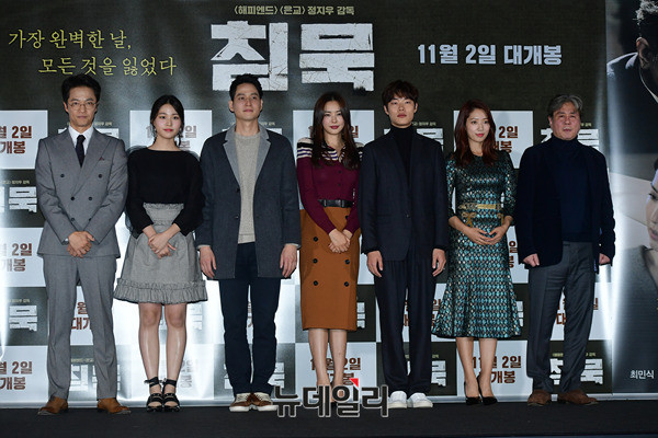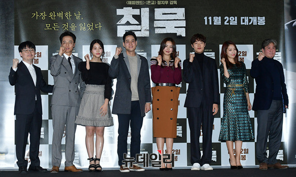 정지우 감독, 배우 조한철, 이수경, 박해준, 이하늬, 류준열, 박신혜, 최민식(왼쪽부터)이 24일 서울 CGV용산아이파크몰에서 열린 영화 '침묵(감독 정지우)' 언론시사회에서 포토타임을 갖고 있다. 침묵은 약혼녀가 살해당하고 그 용의자로 자신의 딸이 지목되자, 딸의 무죄를 위해 자신만의 방식으로 사건을 쫒는 임태산(최민식)의 이야기를 그린 작품. 오는 11월 2일 개봉 예정.